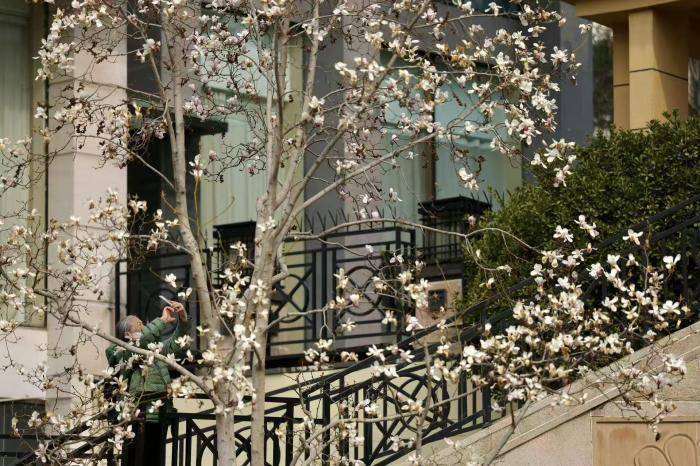 市民仰拍花枝与天空,在花香里感受春日气息。