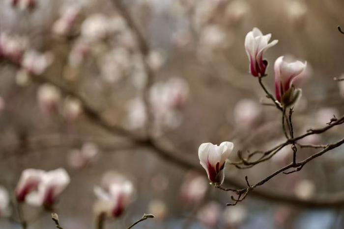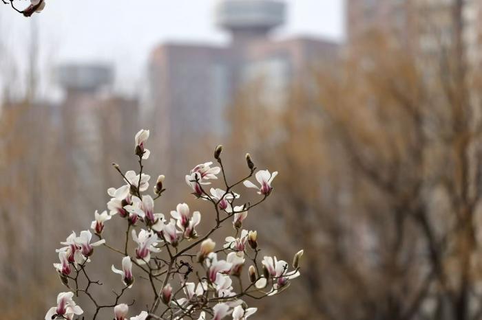 步道旁,几株玉兰树舒展着虬劲的枝桠,花苞次第绽放。